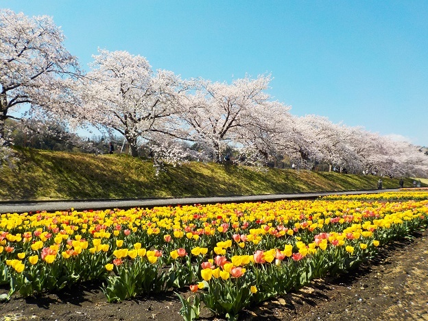 羽村堰の桜とチューリップ